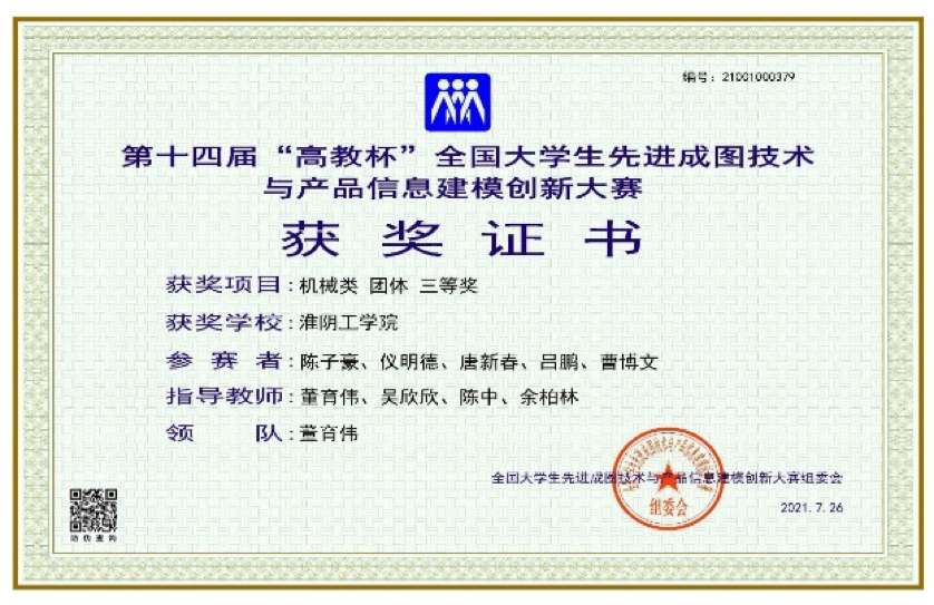 7月18日至7月24日,第十四届“全国大学生先进成图技术与产品信息建模创新大赛国赛”于线上举行,大赛包含了轻量化设计,3D打印技术,机械构型,手绘和机绘这五个部分。淮阴工学院1队陈子豪等人荣获国赛团体三等奖,其中3D协会会长陈子豪荣获个人赛三等奖。