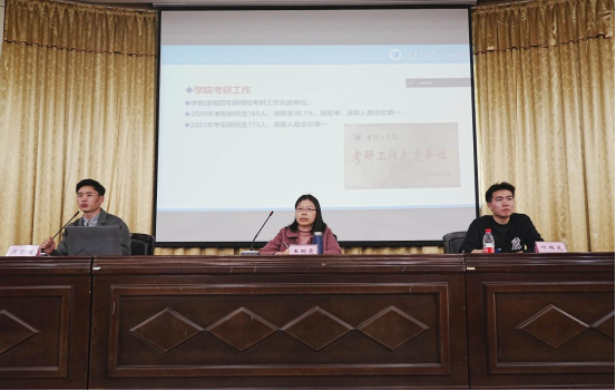 2021届毕业生赵语涵、2022届毕业生王奕羡、祝小燕三位考取研究生的毕业生代表和2019级考研学生代表叶伟龙同学进行了经验交流。他们以线上线下结合的形式分享了自己的考研历程及升学经验,鼓励学弟学妹们要坚定自己的理想信念,努力拼搏,目标坚定准备考研。